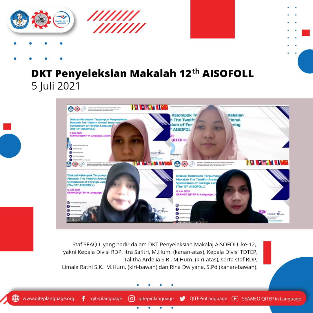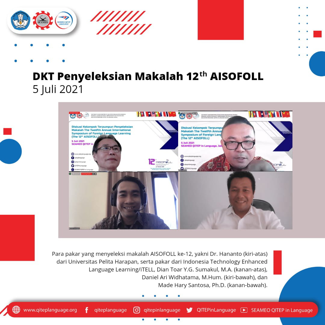 Menjelang penyelenggaraan AISOFOL ke-12 pada bulan Oktober mendatang, SEAMEO QITEP in Language (SEAQIL) menyelenggarakan diskusi kelompok terpumpun penyeleksian makalah yang akan dipresentasikan pada Senin [5/7]. Guna mendapatkan hasil yand maksimal dan proses yang komprehensif, SEAQIL melibatkan empat akademisi, yakni Dr. Hananto (Universitas Pelita Harapan, Tangerang Selatan), serta Made Hery Santosa, Ph.D., Daniel Ari Widhatama, M.Hum., dan Dian Toar Y.G. Sumakul, M.A. (Indonesia Technology Enhanced Language Learning (iTELL)).